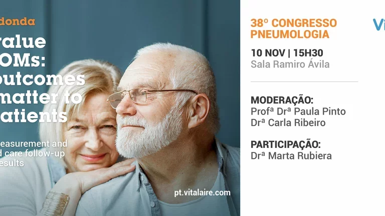 Convidamos todos os profissionais de saúde previamente inscritos no Congresso a assistir à Mesa Redonda promovida pela VitalAire e subordinada ao tema The value of PROMS: The outcomes that matter to our patients - selection, measurement and personalized care follow-up to improve results onde será debatida a importância desta abordagem essencialmente focada no doente e no Valor que lhe é efetivamente gerado na prestação dos cuidados de saúde.